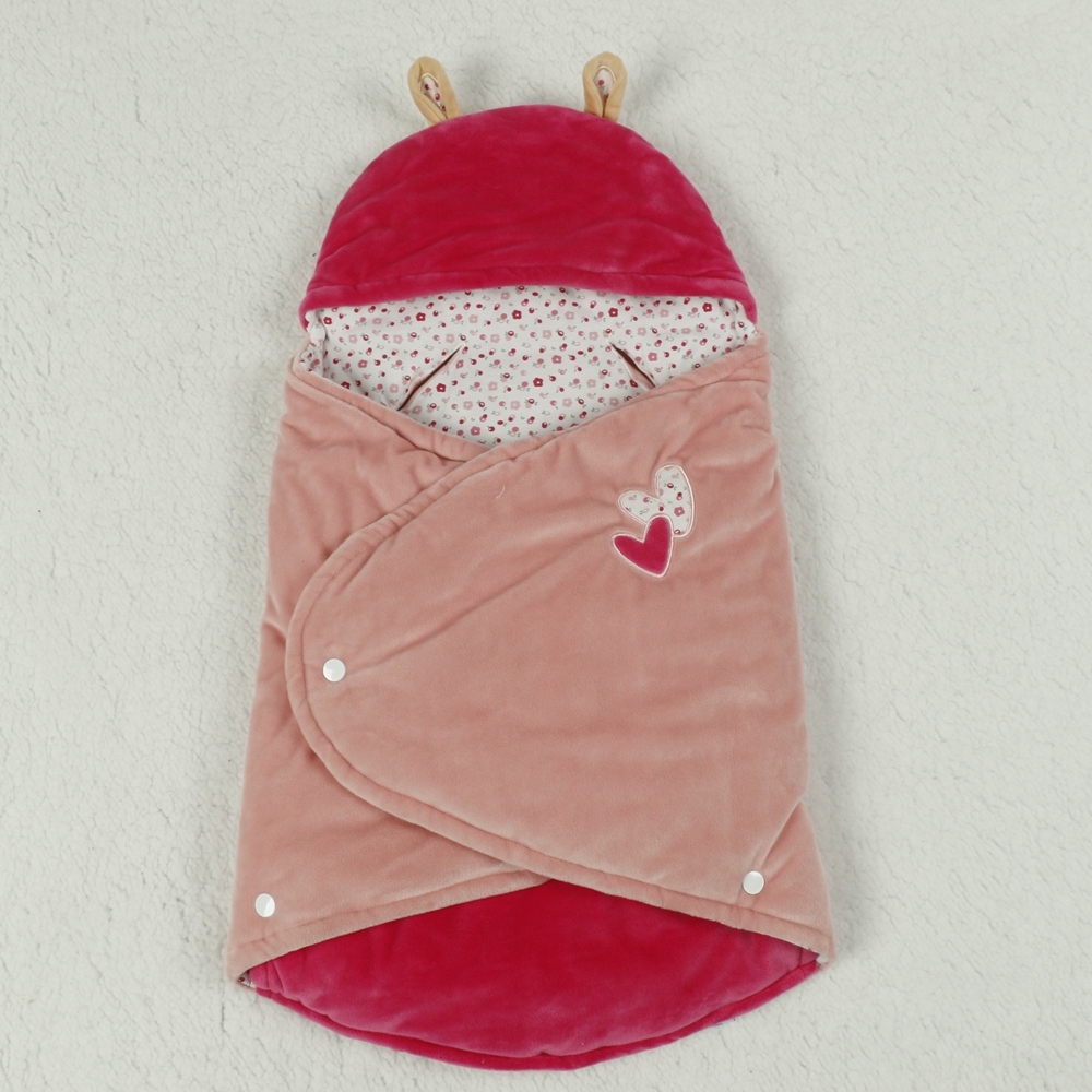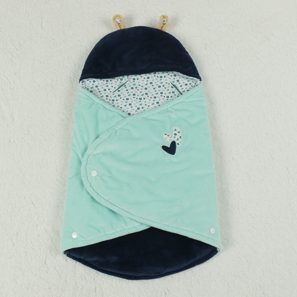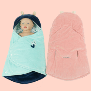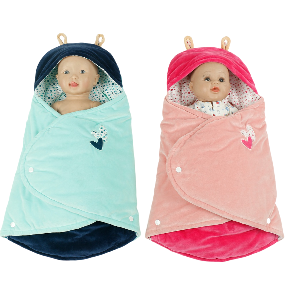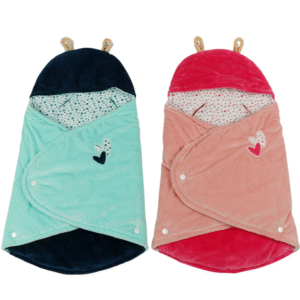 These two short plush baby swaddle blankets are adorable and heartwarming: The left one features a contrast of teal and navy blue. Its short plush fabric feels as soft as a cloud against the skin, with a floral-patterned lining and embroidered black-blue hearts, while the hood’s cute little ears add extra charm. The right one combines pink-orange and wine red. Its smooth plush surface is cozy and warm, paired with a light pink floral lining and embroidered pink-white hearts, and the snap buttons ensure a secure wrap. They are not only warm swaddles but also cute soothing items, excelling in both appearance and practicality.