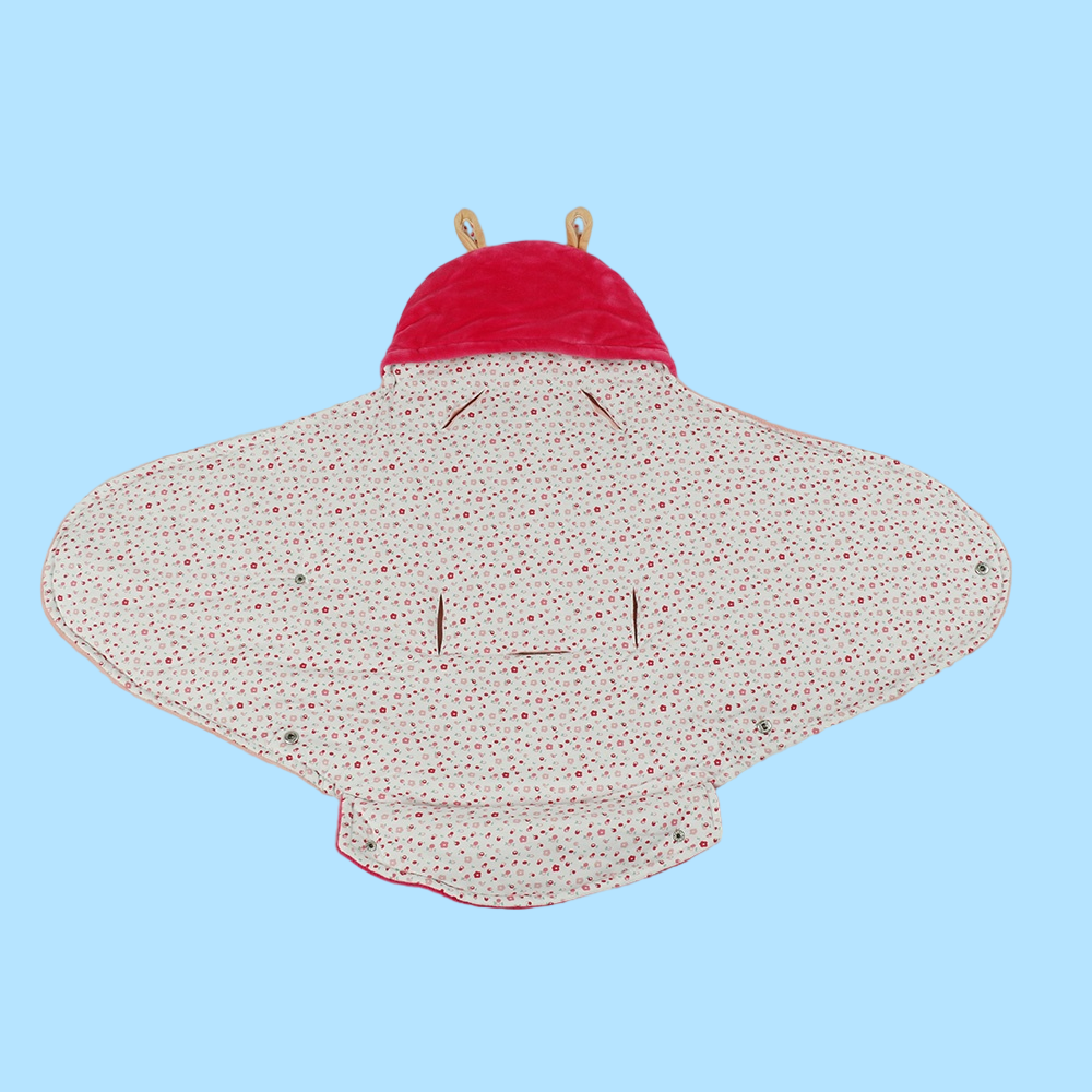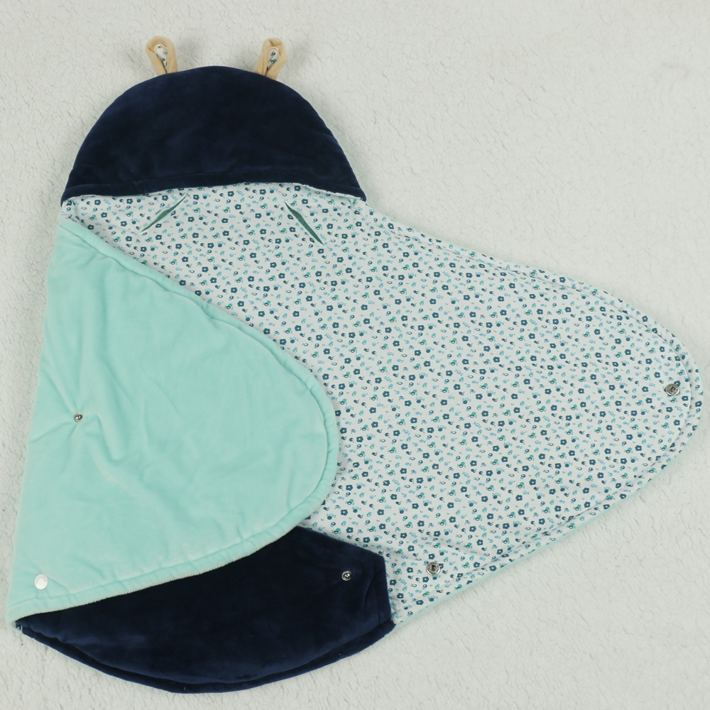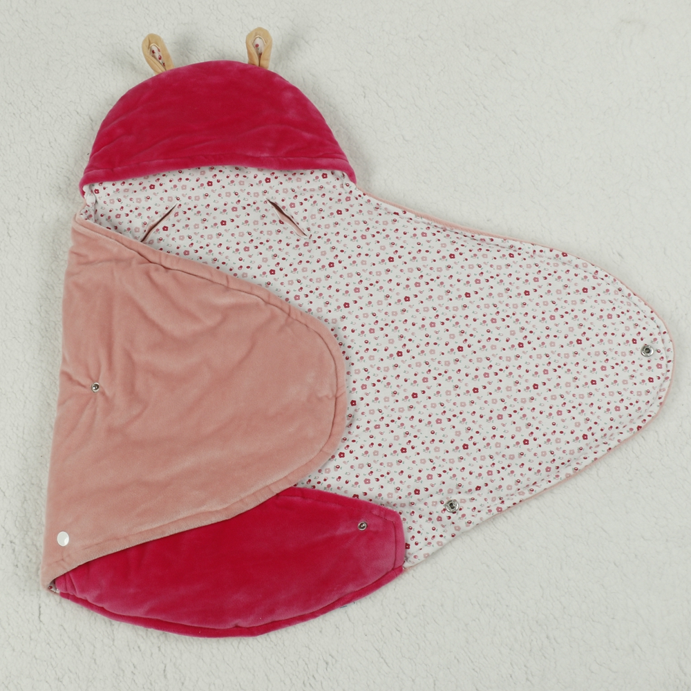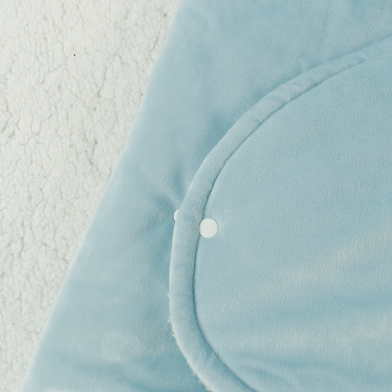 These two short plush baby swaddle blankets are adorable and heartwarming: The left one features a contrast of teal and navy blue. Its short plush fabric feels as soft as a cloud against the skin, with a floral-patterned lining and embroidered black-blue hearts, while the hood’s cute little ears add extra charm. The right one combines pink-orange and wine red. Its smooth plush surface is cozy and warm, paired with a light pink floral lining and embroidered pink-white hearts, and the snap buttons ensure a secure wrap. They are not only warm swaddles but also cute soothing items, excelling in both appearance and practicality.